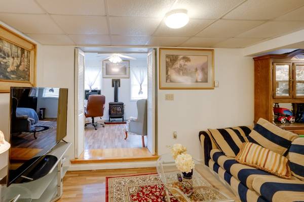 Bedroom: Relax in the cozy bedroom, furnished with a queen-size bed, a sofa bed, a dresser, and closets. Extra air mattress for additional guests. Enjoy entertainment on the smart TV with free Netflix. Additional amenities include a Gas fireplace, a ceiling fan, and central air and heat. The room also features a comfortable reclining chair and a front door leading directly to the landscaped yard.