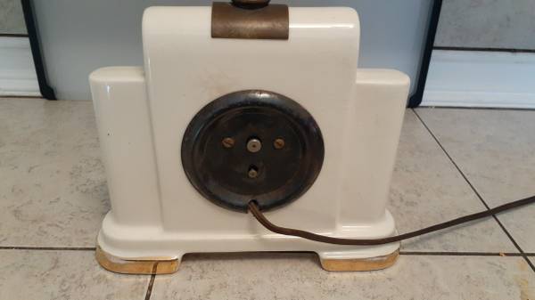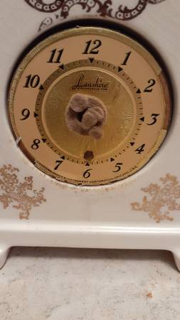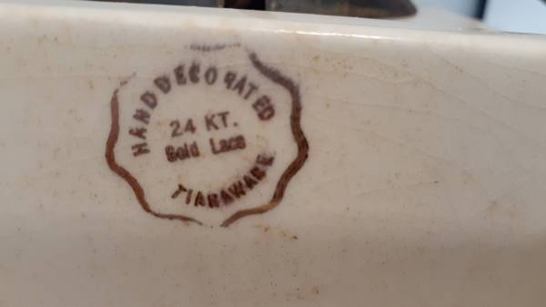 Tiaraware handdecorated 24 KT. gold lace porcelain lamp. This was originally a Lanshire clock with no lamp. Was converted into a lamp by unknown person many years ago. The clock works are still inside and the clock face (no hands) is still under the picture of Joesph Mary and Jesus. The base measures 9.75W x 2.5D x 8H plus lamp socket. $45