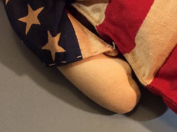 Crudely made but with great charm. Made from the remnants of an old flag, the small handheld type used for decoration on holidays. I bought it many many years ago and completely forgot about its existence. No labels or markings. I assume the rabbit is homemade.