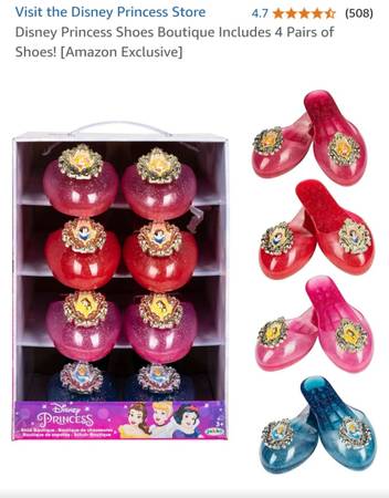 Disney Princess Shoes Boutique Includes 4 Pairs of Shoes! Gently used with love and care. Like new! Fits up to size 13! Glittery finish! Perfect for any Heart Strong Princess. Sturdy & very...