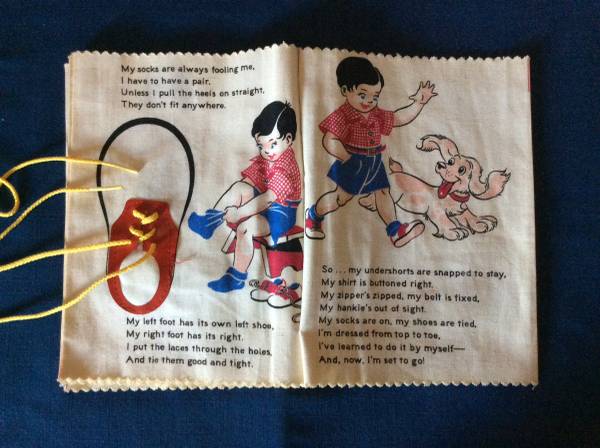 Cloth book “All By Himself” by Kay Clark, is an interactive book published by Plakie Toys, Youngstown OH. The book is in great condition, the “binding” stitching still perfect. The book helps a young child learn to snap, button, zip and buckle clothing plus tie shoes!