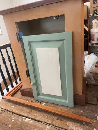 This cute piece is painted several tones. Has hinges in to attach the door. Approx 12” w by 18” h by 7 or 8” deep.