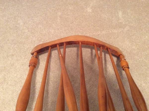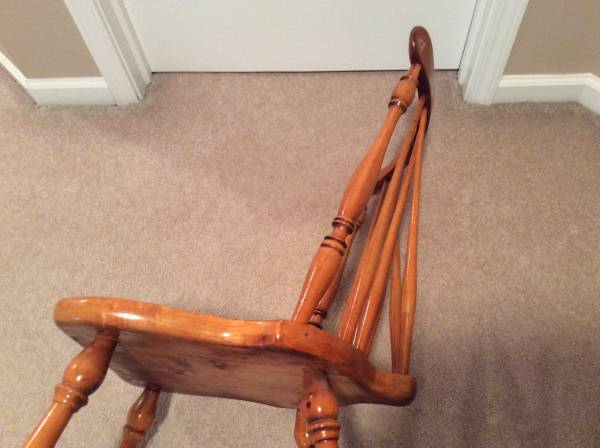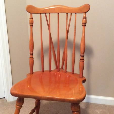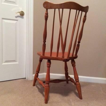 Solid wood side chair with beautiful spindles. Metal tips on bottom of each leg. Chair very sturdy and strong — my husband and I have each STOOD on the chair several times to reach something on high...
