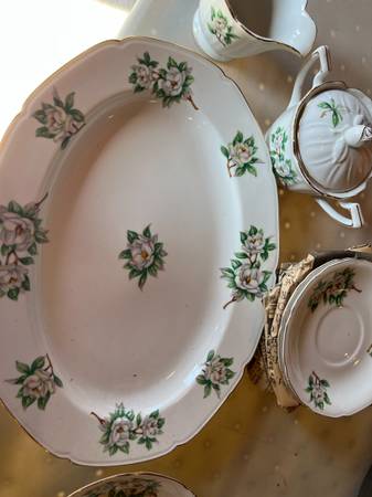 Beautiful set of "Ever Green" china. These are quite old and made in Japan (pre-war). Dishes, saucers, serving plates, creamers, etc. Looks to be a set of 8 (although haven't unwrapped all the plates to count) and no chips in anything that we have found.
