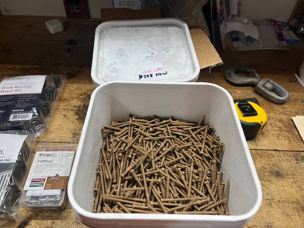 12-3" post caps, 5-3" post inserts, 2-3" impression rail drink rail clip attach kits, 1-Timber Lock Teak Tech Fascia fasteners, 14.5 pounds of top lock color match Teak Tech deck fasteners, 202 Timber Tech edge hidden fasteners, 1-3" x 36" aluminum dark bronze post, 2-3" x 48" aluminum dark bronze post, 1-36"x6' impressions aluminum stair handrail.