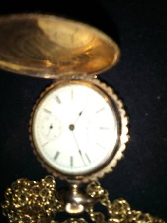 This antique gold pocketwatch is handed down three generations from 1950s. The brand name is Elgin. It is not in working condition but physically is in good condition and comes in a gold 14k keystone case and 12k GE chain.