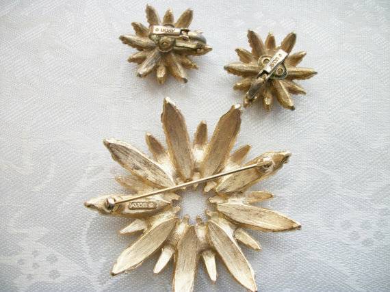 This is a beautiful 1970s set, named Sunburst. All pieces are signed Avon on the back. They have a very pretty brushed gold tone finish. The pin measures 2 3/8" wide (6 cm); the earrings are 1 1/4" wide (3.2 cm) The jewelry is in absolutely perfect condition