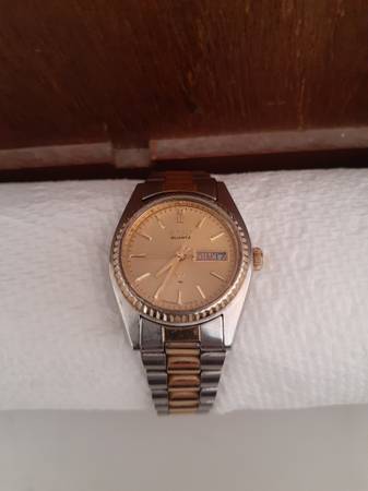 2) Ladies Seiko Quartz (2626-0150) has day and time (Japan). Very nice 2 tone gold and silver. band with deployment clasp. Some scratches. $30