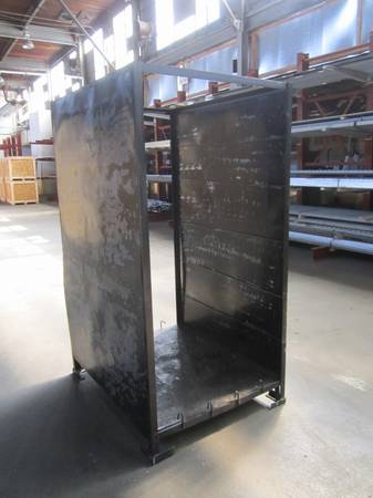. Black metal pallet sized base material handling platform storage unit with 2 enclosed sides. Overall in very good condition. Sheet metal sides are tack welded on. 39" wide x 49" deep x 78.5" high. Opening on each side is 36" wide. 220321