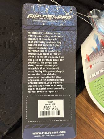 Motorcycle Sport Touring Jacket - size Medium - BLACK - Fieldsheer Brand - NEW with TAGS - NEVER USED. HI-VIS Strips with KEVLAR full pads and back protection; Sport Length - WATERPROOP ALL Weather TOURING perfect for COOL and COLD Weather with insulated removable liner. heavy duty CE PAD shoulder and back protection. very high quality sport touring jacket which cost $349 new - only asking $99. Please use Craig's List EMAIL - asking only $79
