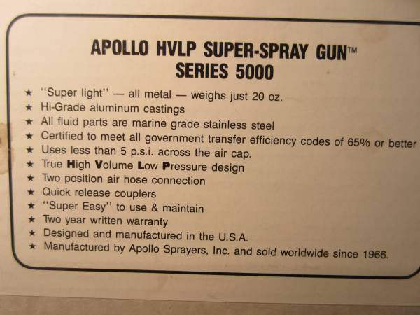 Apollo is the world leader in turbine HVLP technology and their product is USA-made. The company's tech support is outstanding.
