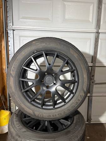 4 Like New 225X60X17 99T Firestone Destination Tires on MB Alloy Wheels. Lug pattern 5x110mm. Fit SAAB, Jeep Compass, Saturn, Chevy Cobalt, Malibu, Chrysler 200, and many others.